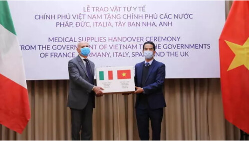 Ngày 06/04, báo chí đã làm đậm chiến lược này khi đăng tải hình ảnh một nhóm đại sứ các nước Châu Âu nhận các hộp khẩu trang từ Bộ Ngoại giao Việt Nam.