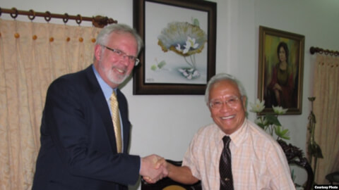 Đại sứ David Shear và Bác sĩ Nguyễn Đan Quế, người sáng lập và là chủ tịch Phong trào Nhân quyền phi bạo lực ở Việt Nam và là ứng viên giải Nobel Hòa bình 2012 tại nhà Bác sĩ Quế, 2012. Bác sĩ Quế là một trong những người bị an ninh theo dõi sát sao.