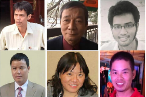 Từ phải sang : Phạm Chí Dũng, Nguyễn Tường Thụy, Lê Hữu Minh Tuấn, Lê Anh Hùng, Phạm Đoan Trang, Hồ Sỹ Quyết. Việt Nam vẫn đang bỏ tù những nhân vật này. (Photo Tập hợp từ Facebook)