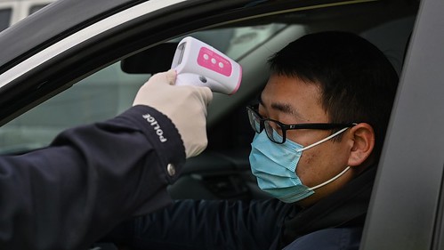 Một cảnh sát viên lấy nhiệt độ của một người lái xe tại một trạm kiểm soát ở ngoại ô Vũ Hán vào thứ Hai. Ảnh minh họa