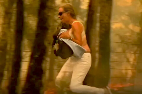 Cảnh một phụ nữ Úc liều mạng nhảy vào lửa rừng để cứu một con koala (gấu bông hay gấu túi)