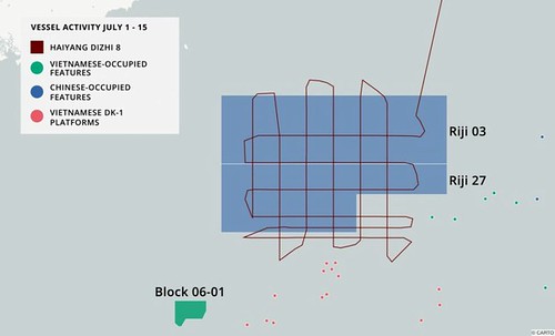 Đồng thời, cũng theo AMTI, vào đầu tháng 7, Trung Quốc điều tàu khảo sát địa chấn Hải Dương 8 cùng các tàu hộ tống đến vùng phía bắc Bãi Tư Chính, nằm trong khu vực 9 lô dầu khí mà Tổng công ty Dầu khí Hải Dương Trung Quốc (CNOOC) đưa ra mời thầu hồi tháng 6 năm 2012 nhưng không có công ty nước ngoài nào muốn tham gia vì những quan ngại về hiệu quả kinh tế.