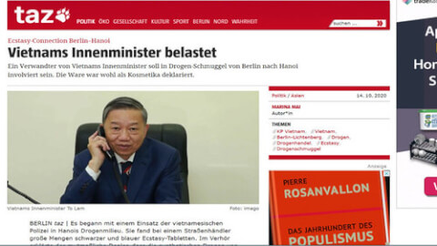 Bài đăng trên nhật báo Taz của Đức với hình Bộ trưởng Bộ Công an Tô Lâm với dòng tin "Một người thân của Bộ trưởng Nội vụ Việt Nam được cho là có liên quan đến vụ buôn lậu ma túy từ Berlin về Hà Nội. Hàng hóa có lẽ đã được khai báo là mỹ phẩm".