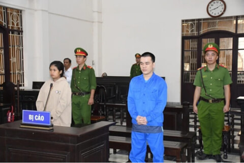 Chị Thạch Thị Kim Nhung và chồng là anh Nguyễn Vũ Hoàng Tuấn tại phiên tòa xét xử ngày 15 tháng 1 năm 2024. Photo : Báo Công an