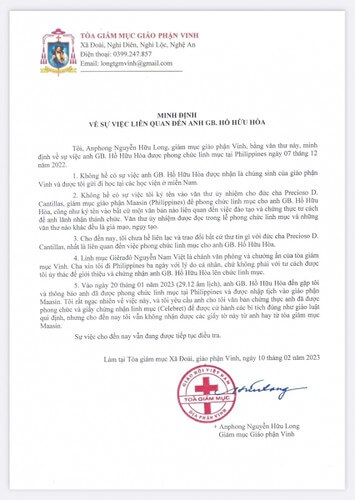 Chúng tôi nhận được một văn bản có chữ ký ghi là của Giám mục Alfonso Nguyễn Hữu Long và con dấu của Giáo phận Vinh. Văn bản này gửi Bề trên cả Dòng Chúa Cứu Thế và Giám tỉnh Dòng Chúa Cứu thế Việt Nam.
