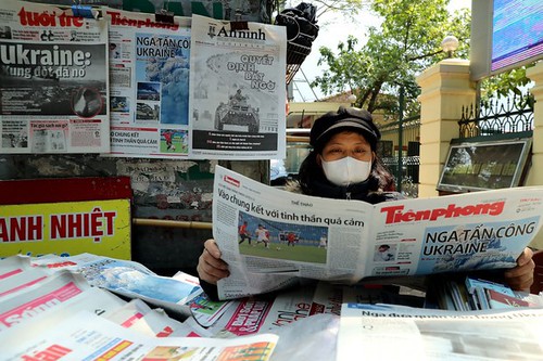 Hình minh hoạ : một người dân đọc báo có bài về cuộc tấn công của Nga vào Ukraine hôm 25/2/2022 ở Hà Nội – AFP