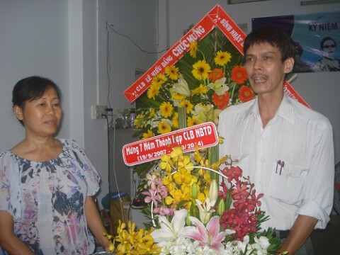 Chủ tịch hội Nhà Báo Việt Nam Độc Lập, ngoài cùng, bên phải, trong buổi sinh hoạt định kì hội Nhà Báo Việt Nam Độc Lập.