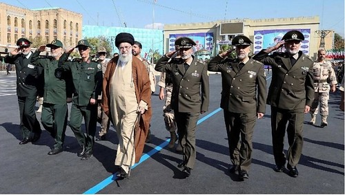 Giáo chủ Ali Khamenei (giữa) tại học viện quân sự Iran ngày 10/10/2023. via Reuters – Wân News Agency