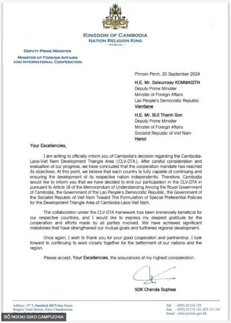 Bộ Ngoại giao Campuchia gửi thư vào ngày 20/9 thông báo cho Lào và Việt Nam việc rời khỏi khuôn khổ hợp tác CLV-DTA - Bộ Ngoại giao Campuchia